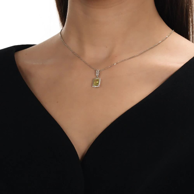 Подвеска с 12 бриллиантами природными, 0.04 карат, огранка круг 17 граней, цвет 2, чистота 2, тип огранки А; 1 кварцем лимонным природным, 1.46 карат; 18 сапфирами бесцветными природными, 0.32 карат; Белое золото 585 пробы.