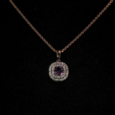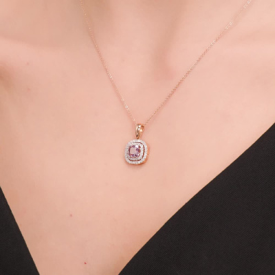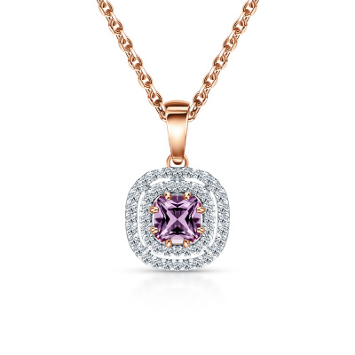 Подвеска с 48 бриллиантами природными, 0.19 карат, огранка круг 17 граней, цвет 2, чистота 2, тип огранки А; 1 аметистом природным, 0.57 карат; Розовое золото 585 пробы.