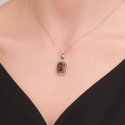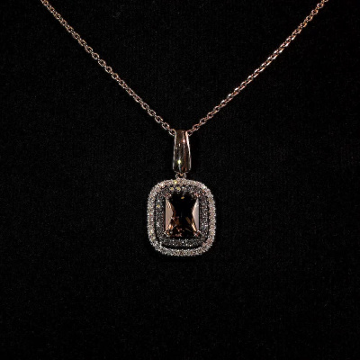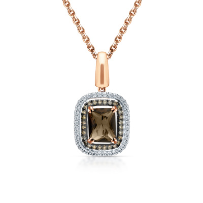Подвеска с 36 бриллиантами природными, 0.22 карат, огранка круг 17 граней, цвет 2, чистота 2, тип огранки А; 1 кварцем дымчатым природным, 1.83 карат; 28 бриллиантами коньячными природными, 0.2 карат, огранка круг 57 граней, цвет 7, чистота 5, тип огранки А; Розовое золото 585 пробы.