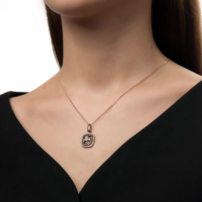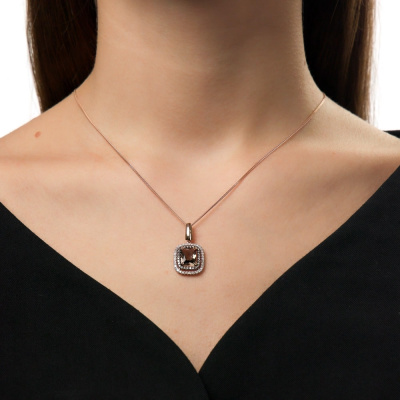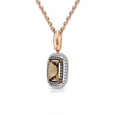 Подвеска с 36 бриллиантами природными, 0.22 карат, огранка круг 17 граней, цвет 2, чистота 2, тип огранки А; 1 кварцем дымчатым природным, 1.79 карат; 28 бриллиантами коньячными природными, 0.2 карат, огранка круг 57 граней, цвет 7, чистота 5, тип огранки А; Розовое золото 585 пробы.