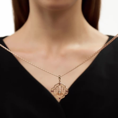 Подвеска с 5 бриллиантами природными, 0.009 карат, огранка круг 17 граней, цвет 2, чистота 2, тип огранки А; 4 рубинами природными, 0.02 карат, цвет 2, чистота 2, тип огранки В; Розовое золото 585 пробы.