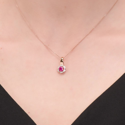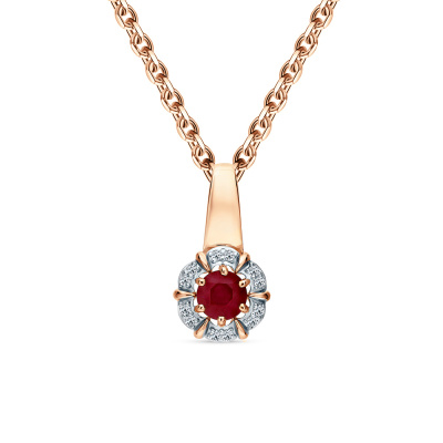 Подвеска с 12 бриллиантами природными, 0.06 карат, огранка круг 57 граней, цвет 4, чистота 5, тип огранки А; 1 рубином природным, 0.44 карат, цвет 2, чистота 2, тип огранки В; Розовое золото 585 пробы.