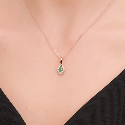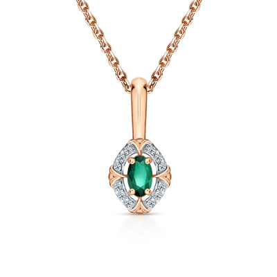 Подвеска с 12 бриллиантами природными, 0.03 карат, огранка круг 57 граней, цвет 4, чистота 5, тип огранки А; 1 изумрудом природным, 0.2 карат, цвет 3, чистота 3, тип огранки Б; Розовое золото 585 пробы.