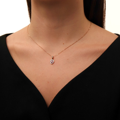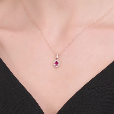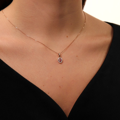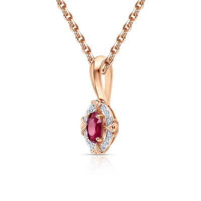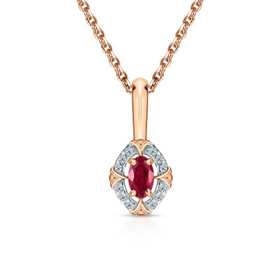 Подвеска с 12 бриллиантами природными, 0.03 карат, огранка круг 57 граней, цвет 4, чистота 5, тип огранки А; 1 рубином природным, 0.28 карат, цвет 2, чистота 2, тип огранки Б; Розовое золото 585 пробы.