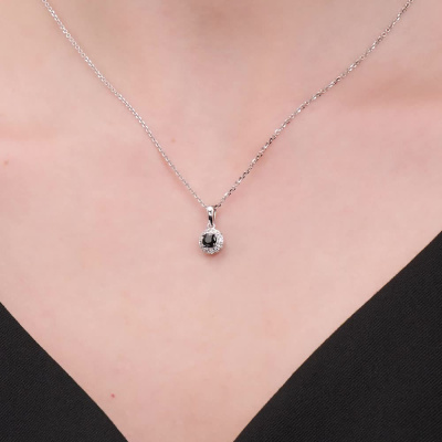 Подвеска с 12 бриллиантами природными, 0.11 карат, огранка круг 17 граней, цвет 2, чистота 3; 1 сапфиром природным, 0.27 карат, цвет 3, чистота 4; Белое золото 585 пробы.