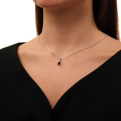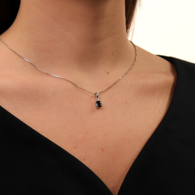 Подвеска с 1 бриллиантом природным, 0.03 карат, огранка круг 57 граней, цвет 3, чистота 6; 1 сапфиром природным, 1.01 карат, цвет 3, чистота 4; Белое золото 585 пробы.