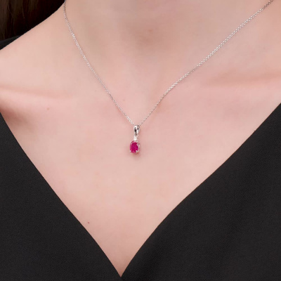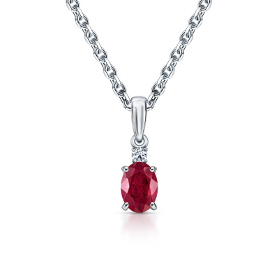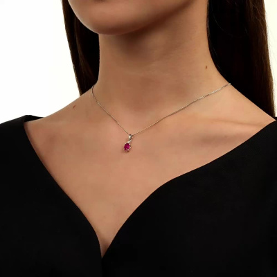 Подвеска с 1 бриллиантом природным, 0.03 карат, огранка круг 57 граней, цвет 3, чистота 6; 1 рубином природным, 0.97 карат, цвет 3, чистота 4; Белое золото 585 пробы.