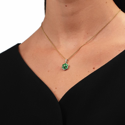 Подвеска с 2 бриллиантами природными, 0.03 карат, огранка круг 57 граней, цвет 3, чистота 6; 1 бриллиантом природным, 0.01 карат, огранка круг 17 граней, цвет 2, чистота 3; 29 бриллиантами природными, 0.18 карат, огранка круг 17 граней, цвет 2, чистота 3; 1 бриллиантом природным, 0.004 карат, огранка круг 17 граней, цвет 2, чистота 3; 6 изумрудами природными, 0.76 карат, цвет 4, чистота 3; Желтое золото 585 пробы.