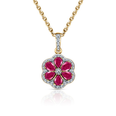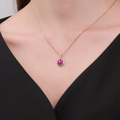 Подвеска с 2 бриллиантами природными, 0.03 карат, огранка круг 57 граней, цвет 3, чистота 6; 1 бриллиантом природным, 0.009 карат, огранка круг 17 граней, цвет 2, чистота 3; 29 бриллиантами природными, 0.17 карат, огранка круг 17 граней, цвет 2, чистота 3; 1 бриллиантом природным, 0.004 карат, огранка круг 17 граней, цвет 2, чистота 3; 6 рубинами природными, 1.19 карат, цвет 3, чистота 4; Желтое золото 585 пробы.