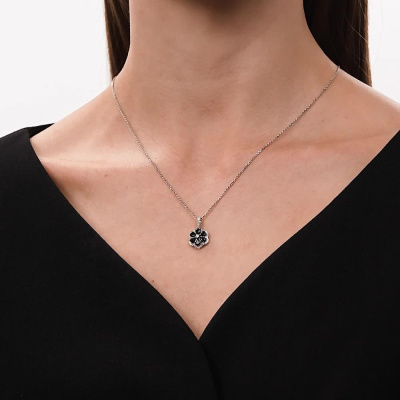 Подвеска с 2 бриллиантами природными, 0.03 карат, огранка круг 57 граней, цвет 3, чистота 6; 1 бриллиантом природным, 0.009 карат, огранка круг 17 граней, цвет 2, чистота 3; 29 бриллиантами природными, 0.17 карат, огранка круг 17 граней, цвет 2, чистота 3; 1 бриллиантом природным, 0.004 карат, огранка круг 17 граней, цвет 2, чистота 3; 6 сапфирами природными, 1.1 карат, цвет 3, чистота 4; Белое золото 585 пробы.