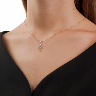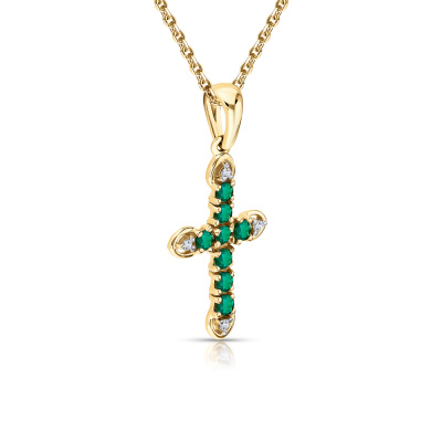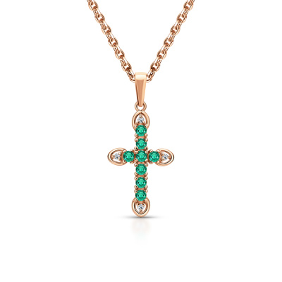 Подвеска с 4 бриллиантами природными, 0.02 карат, огранка круг 17 граней, цвет 2, чистота 3; 8 изумрудами природными, 0.18 карат, цвет 4, чистота 3; Желтое золото 585 пробы.