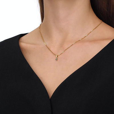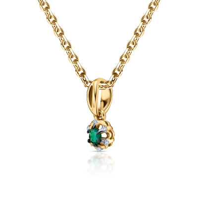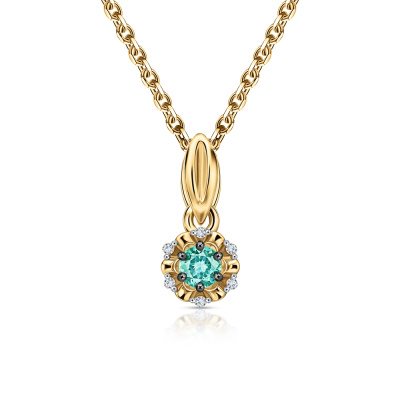 Подвеска с 6 бриллиантами природными, 0.01 карат, огранка круг 17 граней, цвет 2, чистота 3; 1 изумрудом природным, 0.08 карат, цвет 4, чистота 3; Желтое золото 585 пробы.