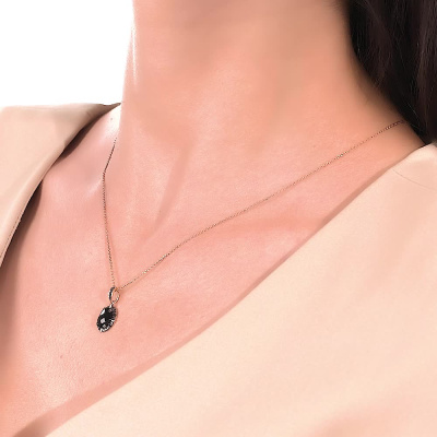 Подвеска с 1 агатом черным природным, 1.66 карат; 5 бриллиантами черными природными облагороженными, 0.02 карат, огранка круг 57 граней, цвет 7, чистота 6, тип огранки А; 20 бриллиантами черными природными облагороженными, 0.07 карат, огранка круг 57 граней, цвет 7, чистота 6, тип огранки А; Розовое золото 585 пробы.