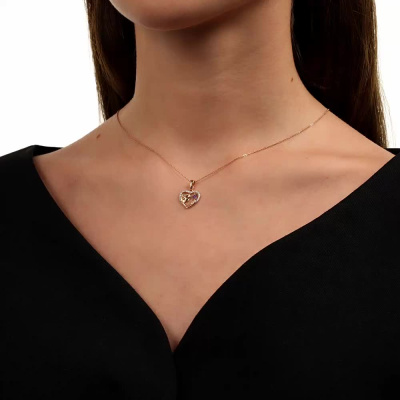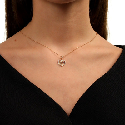 Подвеска с 21 бриллиантом природным, 0.04 карат, огранка круг 17 граней, цвет 2, чистота 2, тип огранки Б; 3 рубинами синтетическими, 0.01 карат; Розовое золото 585 пробы.