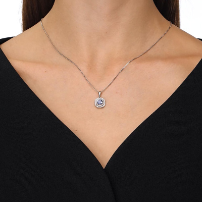 Подвеска с 48 бриллиантами природными, 0.2 карат, огранка круг 17 граней, цвет 2, чистота 2, тип огранки А; 1 танзанитом природным, 0.68 карат; Белое золото 585 пробы.