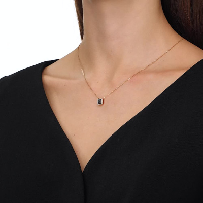 Подвеска с 20 бриллиантами природными, 0.04 карат, огранка круг 17 граней, цвет 2, чистота 2, тип огранки А; 9 бриллиантами черными природными облагороженными, 0.03 карат, огранка круг 57 граней, цвет 7, чистота 6, тип огранки А; Розовое золото 585 пробы.