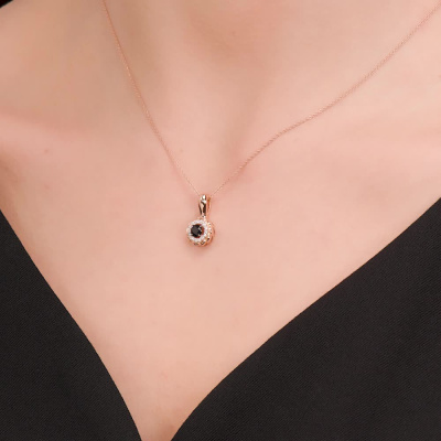 Подвеска с 16 бриллиантами природными, 0.05 карат, огранка круг 17 граней, цвет 2, чистота 2, тип огранки Б; 1 сапфиром природным, 0.28 карат, цвет 2, чистота 2, тип огранки В; Розовое золото 585 пробы.