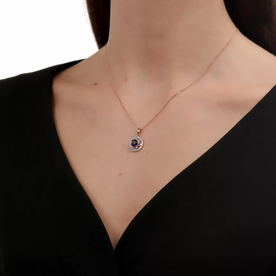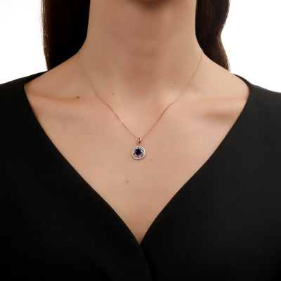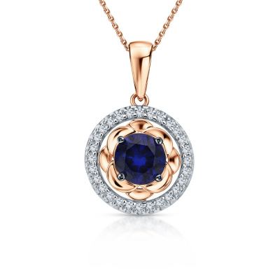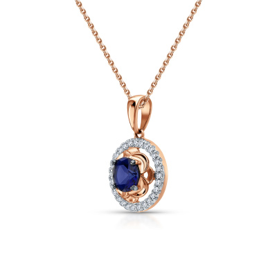 Подвеска с 28 бриллиантами природными, 0.14 карат, огранка круг 17 граней, цвет 2, чистота 2, тип огранки А; 1 сапфиром синтетическим, 1.02 карат; Розовое золото 585 пробы.