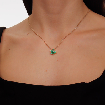 Подвеска с 3 изумрудами выращенными Колумбия, 0.52 карат; 2 изумрудами выращенными Колумбия, 0.21 карат; 1 бриллиантом выращенным, 0.01 карат, огранка круг 57 граней, цвет 3, чистота 5, тип огранки А; Желтое золото 585 пробы.