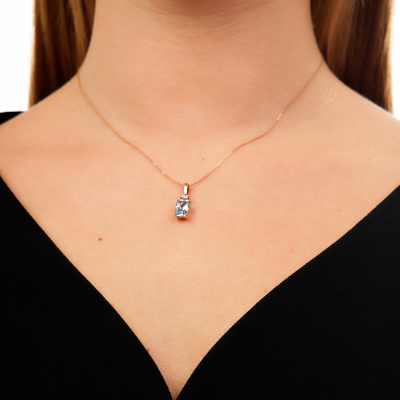 Подвеска с 1 бриллиантом природным, 0.008 карат, огранка круг 17 граней, цвет 2, чистота 2, тип огранки А; 1 топазом скай природным, 1.83 карат; Розовое и белое золото 585 пробы.