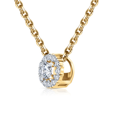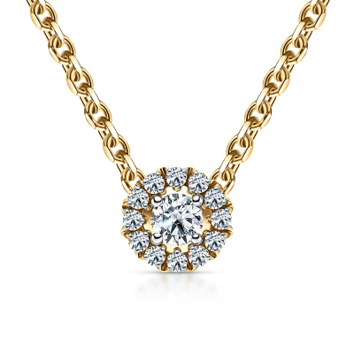 Подвеска с 1 бриллиантом выращенным, 0.12 карат, огранка круг 57 граней, цвет 3, чистота 6, тип огранки А; 12 бриллиантами выращенными, 0.09 карат, огранка круг 57 граней, цвет 3, чистота 6, тип огранки А; Желтое золото 585 пробы.