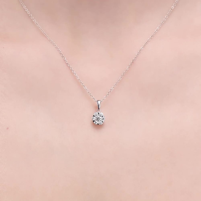 Подвеска с 1 бриллиантом выращенным, 0.19 карат, огранка круг 57 граней, цвет 3, чистота 6, тип огранки А; 6 бриллиантами выращенными, 0.27 карат, огранка круг 57 граней, цвет 3, чистота 6, тип огранки А; Белое золото 585 пробы.