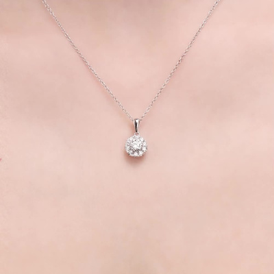 Подвеска с 1 бриллиантом выращенным, 0.51 карат, огранка круг 57 граней, цвет 3, чистота 6, тип огранки А; 10 бриллиантами выращенными, 0.28 карат, огранка круг 57 граней, цвет 3, чистота 6, тип огранки А; Белое золото 585 пробы.