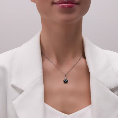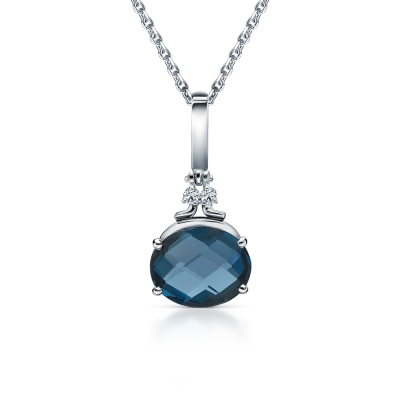 Подвеска с 2 бриллиантами природными, 0.03 карат, огранка круг 57 граней, цвет 3, чистота 6, тип огранки А; 1 топазом лондон природным, 3.01 карат, тип огранки А; Белое золото 585 пробы.
