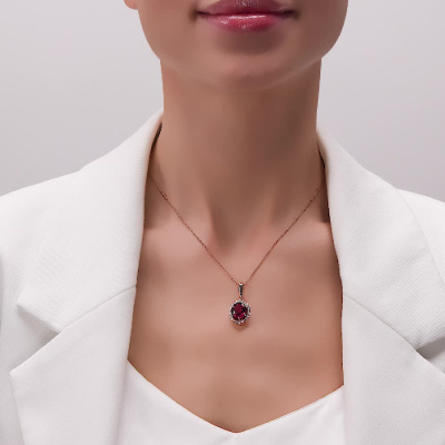 Подвеска с 6 бриллиантами природными, 0.19 карат, огранка круг 57 граней, цвет 3, чистота 6, тип огранки А; 12 бриллиантами природными, 0.16 карат, огранка круг 57 граней, цвет 3, чистота 6, тип огранки А; 1 родолитом природным, 2.8 карат, тип огранки А; золото 585 пробы.