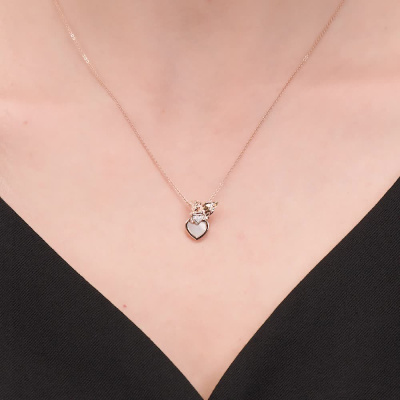 Подвеска с 1 бриллиантом природным, 0.007 карат, огранка круг 57 граней, цвет 4, чистота 5, тип огранки А; 1 перламутром белым природным; Розовое и белое золото 585 пробы.