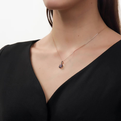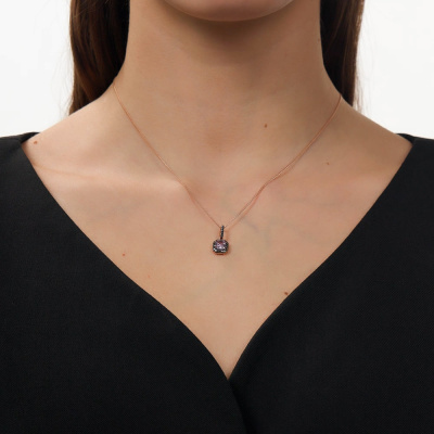 Подвеска с 1 аметистом природным, 0.6 карат; 26 бриллиантами черными природными облагороженными, 0.11 карат, огранка круг 57 граней, цвет 7, чистота 6, тип огранки А; Розовое золото 585 пробы.
