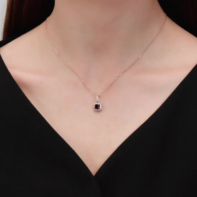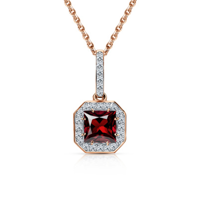 Подвеска с 26 бриллиантами природными, 0.11 карат, огранка круг 17 граней, цвет 2, чистота 2, тип огранки А; 1 гранатом природным, 0.8 карат; Розовое золото 585 пробы.