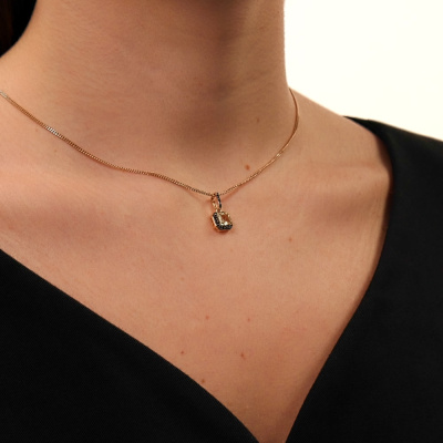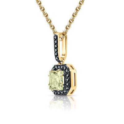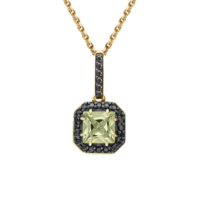 Подвеска с 1 кварцем лимонным природным, 0.6 карат; 26 бриллиантами черными природными облагороженными, 0.11 карат, огранка круг 57 граней, цвет 7, чистота 6, тип огранки А; Желтое золото 585 пробы.
