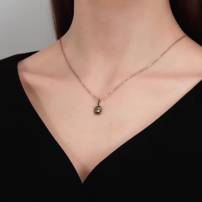 Подвеска с 1 кварцем лимонным природным, 0.64 карат; 26 бриллиантами черными природными облагороженными, 0.11 карат, огранка круг 57 граней, цвет 7, чистота 6, тип огранки А; Желтое золото 585 пробы.