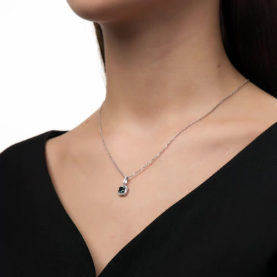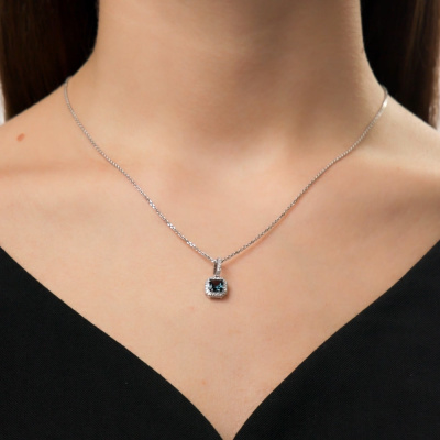 Подвеска с 26 бриллиантами природными, 0.1 карат, огранка круг 17 граней, цвет 2, чистота 2, тип огранки А; 1 топазом лондон природным, 0.74 карат; Белое золото 585 пробы.