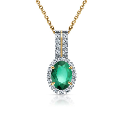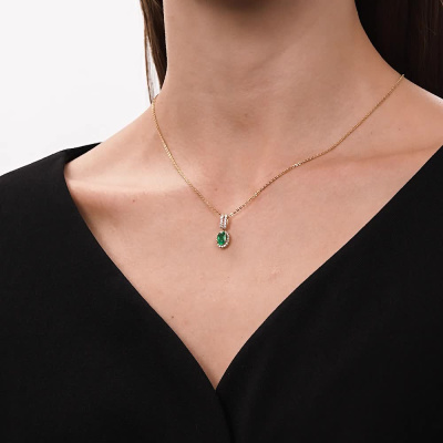 Подвеска с 26 бриллиантами природными, 0.2 карат, огранка круг 57 граней, цвет 3, чистота 6, тип огранки А; 1 изумрудом природным, 0.69 карат, цвет 3, чистота 3, тип огранки Б; Желтое золото 750 пробы.