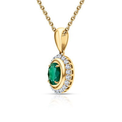 Подвеска с 18 бриллиантами природными, 0.27 карат, огранка круг 57 граней, цвет 3, чистота 6, тип огранки А; 1 изумрудом природным, 0.73 карат, цвет 3, чистота 3, тип огранки Б; Желтое золото 585 пробы.
