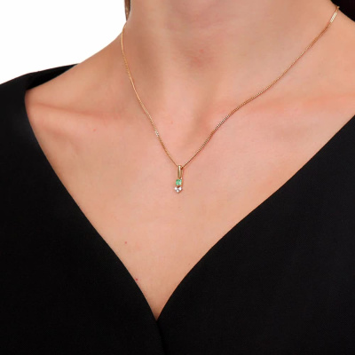 Подвеска с 2 бриллиантами природными, 0.03 карат, огранка круг 57 граней, цвет 3, чистота 6, тип огранки А; 1 бриллиантом природным, 0.01 карат, огранка круг 57 граней, цвет 3, чистота 6, тип огранки А; 1 изумрудом природным, 0.13 карат, цвет 3, чистота 3, тип огранки Б; Желтое золото 585 пробы.
