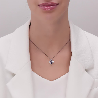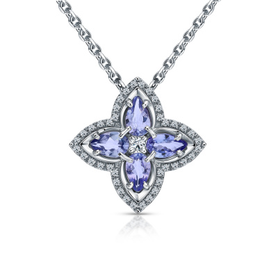 Подвеска с 1 бриллиантом природным, 0.02 карат, огранка круг 57 граней, цвет 3, чистота 5, тип огранки А; 40 бриллиантами природными, 0.15 карат, огранка круг 57 граней, цвет 3, чистота 5, тип огранки А; 4 танзанитами природными, 0.75 карат, тип огранки Б; Белое золото 585 пробы.