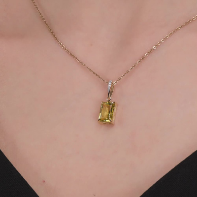Подвеска с 3 бриллиантами природными, 0.01 карат, огранка круг 17 граней, цвет 2, чистота 2, тип огранки А; 1 кварцем лимонным природным, 2.23 карат; Желтое золото 585 пробы.