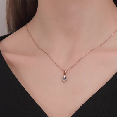 Подвеска с 14 бриллиантами природными, 0.06 карат, огранка круг 17 граней, цвет 2, чистота 2, тип огранки А; 1 топазом скай природным, 0.51 карат; Розовое золото 585 пробы.