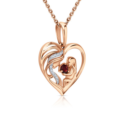 Подвеска с 10 бриллиантами природными, 0.04 карат, огранка круг 17 граней, цвет 2, чистота 2, тип огранки А; 1 гранатом природным, 0.14 карат, тип огранки Б; Розовое золото 585 пробы.