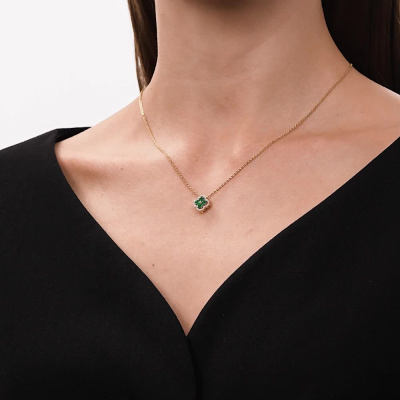 Подвеска с 24 бриллиантами природными, 0.06 карат, огранка круг 17 граней, цвет 2, чистота 2, тип огранки А; 4 изумрудами природными, 0.31 карат, цвет 3, чистота 3, тип огранки В; Желтое золото 585 пробы.