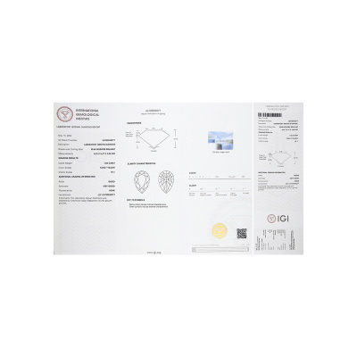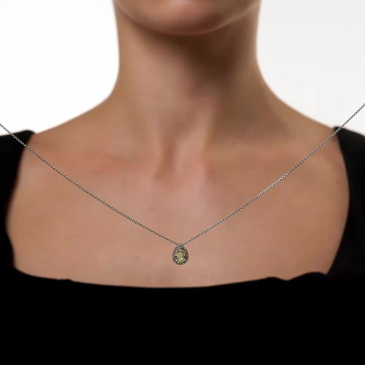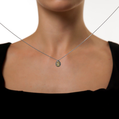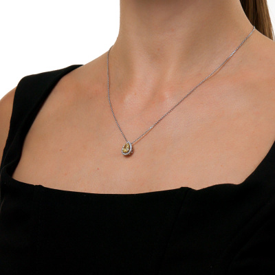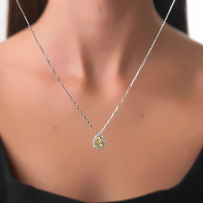 Подвеска с 1 бриллиантом выращенным, 1.01 карат, огранка груша 56 граней, цвет Желтый, чистота 5, тип огранки А; 20 бриллиантами выращенными, 0.15 карат, огранка круг 57 граней, цвет 3, чистота 5, тип огранки А; Желтое и белое золото 585 пробы.