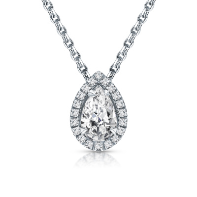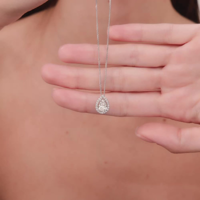 Подвеска с 1 бриллиантом выращенным, 0.85 карат, огранка груша 56 граней, цвет 4, чистота 5, тип огранки А; 20 бриллиантами выращенными, 0.13 карат, огранка круг 57 граней, цвет 3, чистота 5, тип огранки А; Белое золото 585 пробы.