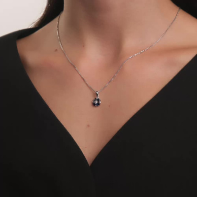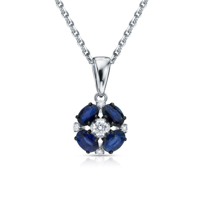 Подвеска с 1 бриллиантом природным, 0.03 карат, огранка круг 57 граней, цвет 3, чистота 6, тип огранки А; 4 бриллиантами природными, 0.03 карат, огранка круг 57 граней, цвет 3, чистота 6, тип огранки А; 4 сапфирами природными, 0.82 карат, цвет 2, чистота 2, тип огранки Б; Белое золото 585 пробы.