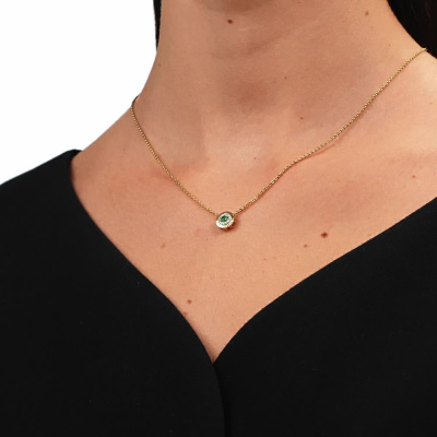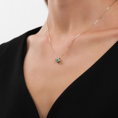 Подвеска с 14 бриллиантами природными, 0.05 карат, огранка круг 17 граней, цвет 2, чистота 2, тип огранки Б; 1 изумрудом природным, 0.09 карат, цвет 3, чистота 3, тип огранки В; Желтое золото 585 пробы.
