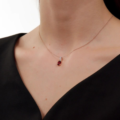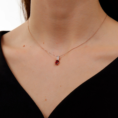 Подвеска с 6 бриллиантами природными, 0.03 карат, огранка круг 17 граней, цвет 2, чистота 2, тип огранки А; 1 гранатом природным, 1.37 карат; Розовое золото 585 пробы.