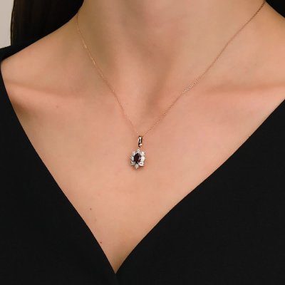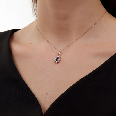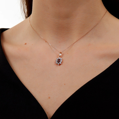 Подвеска с 8 бриллиантами природными, 0.11 карат, огранка круг 57 граней, цвет 4, чистота 5, тип огранки А; 1 гранатом природным, 0.55 карат; Розовое и белое золото 585 пробы.