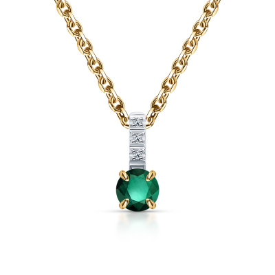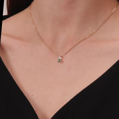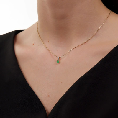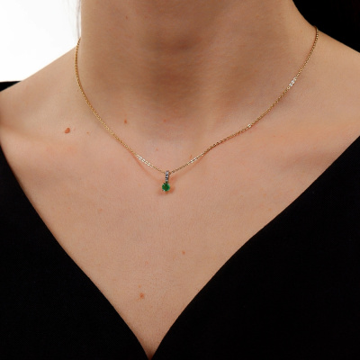 Подвеска с 3 бриллиантами природными, 0.008 карат, огранка круг 17 граней, цвет 2, чистота 2, тип огранки Б; 1 изумрудом природным, 0.2 карат, цвет 3, чистота 3, тип огранки В; Желтое золото 585 пробы.